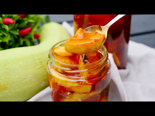 Аппетитные кабачки, маринованные с чесноком, томатной пастой и кетчупом, с ароматной зеленью и специями. Пикантная закуска на зиму.
