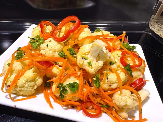 Яркий и хрустящий салат из цветной капусты с морковью и болгарским перцем, ароматизированный чесноком и кунжутом. По рецепту от канала Милена Кулинарные Pецепты салат получается легким, витаминным и идеально подходит как гарнир или самостоятельное блюдо.